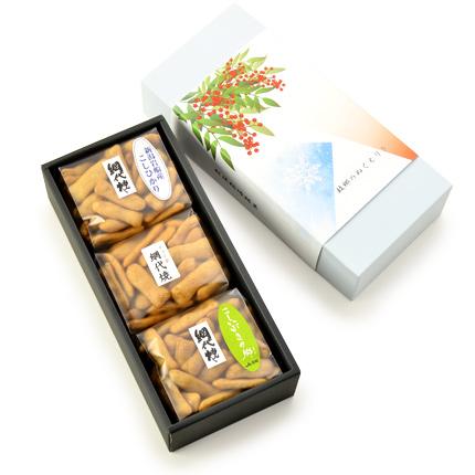 贅沢品であったくろ羊かんともうひとつ、「おいしいと喜ばれる毎日のおやつを」との思いから、先代が開発した「網代焼」。明治時代から変わらずに、カチャンカチャンと小気味よい音を立てる機械でつくられる、日本初の機械づくり米菓としても知られています。米所・新潟ならではの上質なうるち米にえび粉を加え、味付けは醤油ダレでシンプルに。焼き上がりはふっくらさっくり。米の甘みと香ばしい醤油の風味が、クセになるおやつです。かわいい魚の形をした菓子は、無添加なのでお子様のおやつにもぴったり。お父さんにはお酒のつまみにと、家族みんなを笑顔にしてくれる伝統米菓です。
